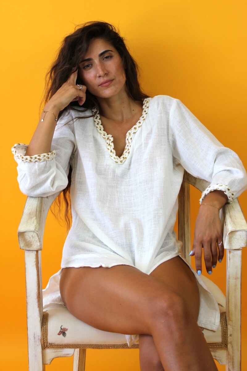 - V-neck, long sleeves with golden theards finish